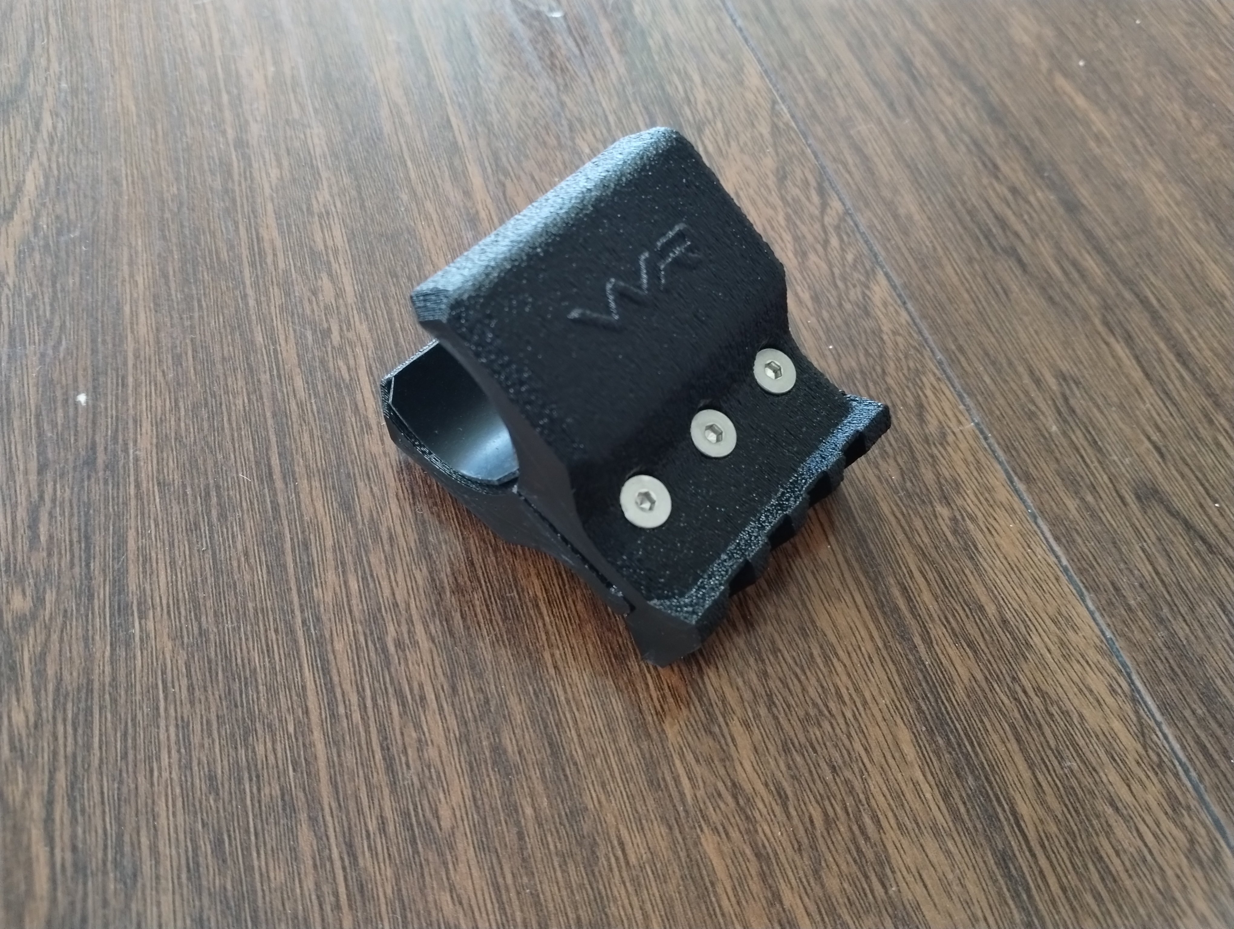 Abrazadera con riel para depósitos de 35mm, incluye riel para bipode o linterna de 20mm (22mm), incluye goma antideslizante. Estabilidad garantizada. Material ABS.
